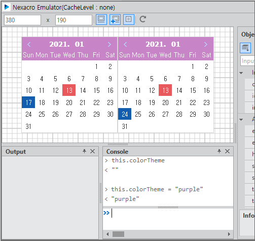 Run the emulator, select the date in the first Calendar component, call the added method in the console window, and check that the value is set in the second Calendar component.
