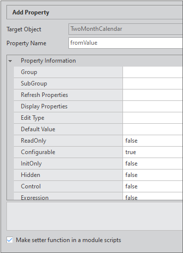 Checking "Make setter function in a module scripts" item automatically generates the Setter Function skeleton code of the property. If any of the metainfo items, unused, readonly, or initonly, is set to true, the corresponding checkbox is disabled.