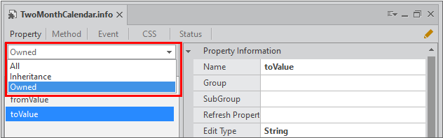 Enum property refers to a property that can specify a value in the form of enumeration. For example, the type property value of the Calendar component can be selected from 3 values of "normal | monthonly | spin", which is used by adding a property value that can be specified in advance as the EnumInfo property.