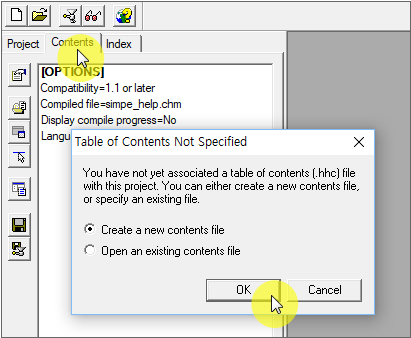 When you select the Contents tab, it will ask if you want to generate a new hhc file. With the [Create a new contents file] item selected, click the [OK] button.