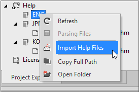 On the Project Explorer tab, select the language (CHN, ENG, JPN, KOR) folder under the Help item, and select the [Import Help Files] item from the context menu.