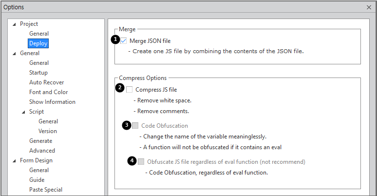 1 | Merge | (1) Set whether to merge the to-be-distributed list of Javascript files registered in the JSON module file into one file. |