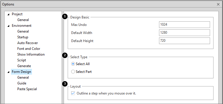 2 | Select Type | The way of dragging a rectangle on the Form design panel to select components. Go to Selection Change for the details. |