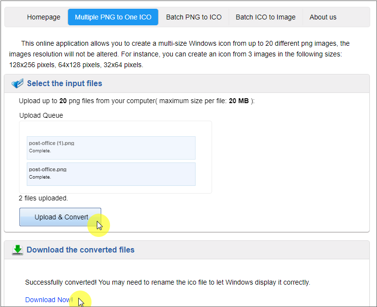 [Upload & Convert] 버튼을 클릭해 두 개의 이미지 파일을 업로드하면 ico 파일로 변환되고 ico 파일을 내려받을 수 있는 링크가 표시됩니다.