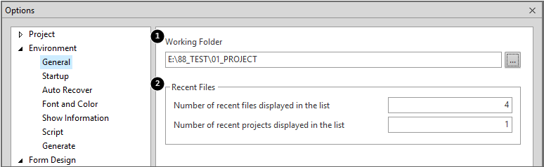 1 | Working Folder | 신규 프로젝트 생성 시 프로젝트를 저장하는 폴더를 지정 |