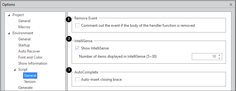 1 | Remove Event | 속성창에서 생성된 이벤트를 삭제했을 때 이벤트 함수 코드를 주석으로 처리할지를 설정 |