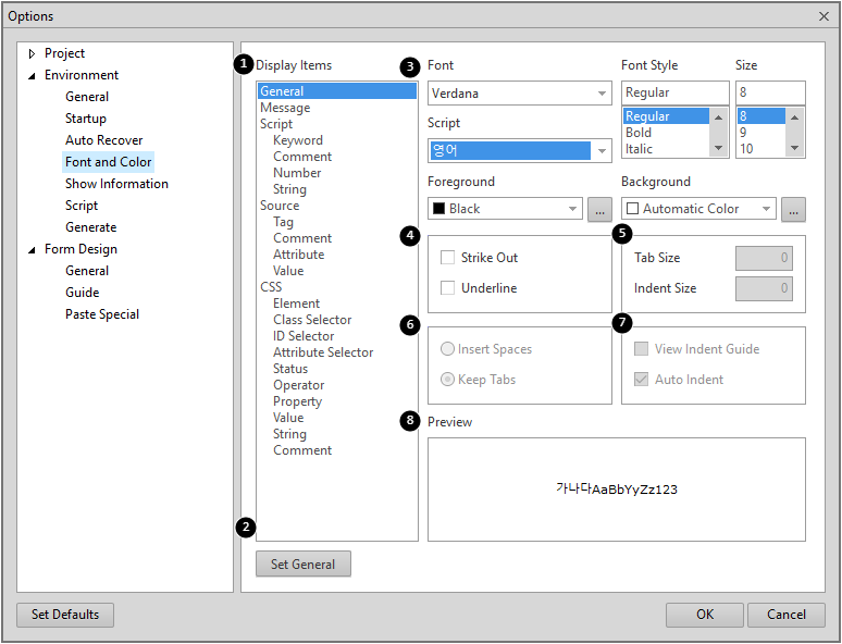 2 | Set General | Display Items에서 'General' 항목값으로 설정한 값을 Display Items 나머지 항목에 반영합니다. 기본 Font, Color 스타일을 설정하고 나머지 Display Items를 직접 수정하고자 할 때 사용할 수 있습니다. 예를 들어 'General' 항목의 Size 값을 9로 변경하고 'Set General' 버튼 클릭 시 나머지 항목의 Size 값이 모두 9로 변경됩니다. |