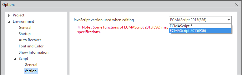Version 옵션을 기본값 "ECMAScript 2015(ES6)"으로 선택하는 경우에는 실행환경에 따라 스크립트 오류가 발생할 수 있습니다. 사용자 환경을 고려해서 코드를 작성해야 합니다.