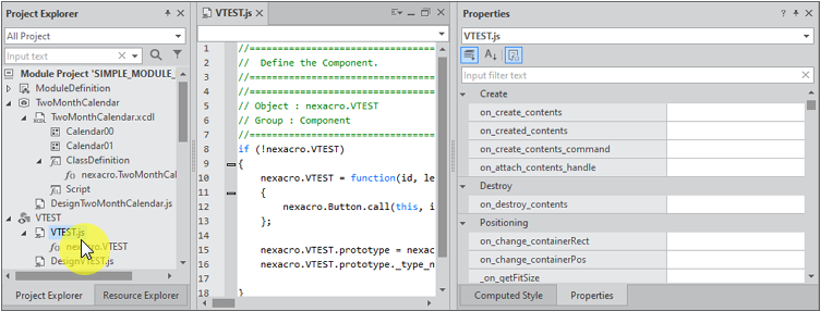 Project Explorer 탭에서 .xcdl 파일(Composite Component) 또는 [Object 명].js 파일을 속성창에서 오브젝트 인터페이스 목록을 확인할 수 있습니다. 넥사크로 스튜디오에서 이벤트를 추가하는 방식과 마찬가지로 각 항목을 더블클릭하면 기본 템플릿이 생성됩니다.