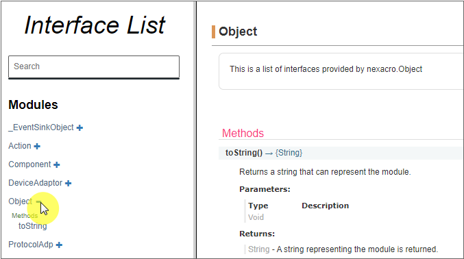 Modules 목록에서 오브젝트 타입을 선택하면 제공하는 오브젝트 인터페이스 함수 목록을 표시합니다.