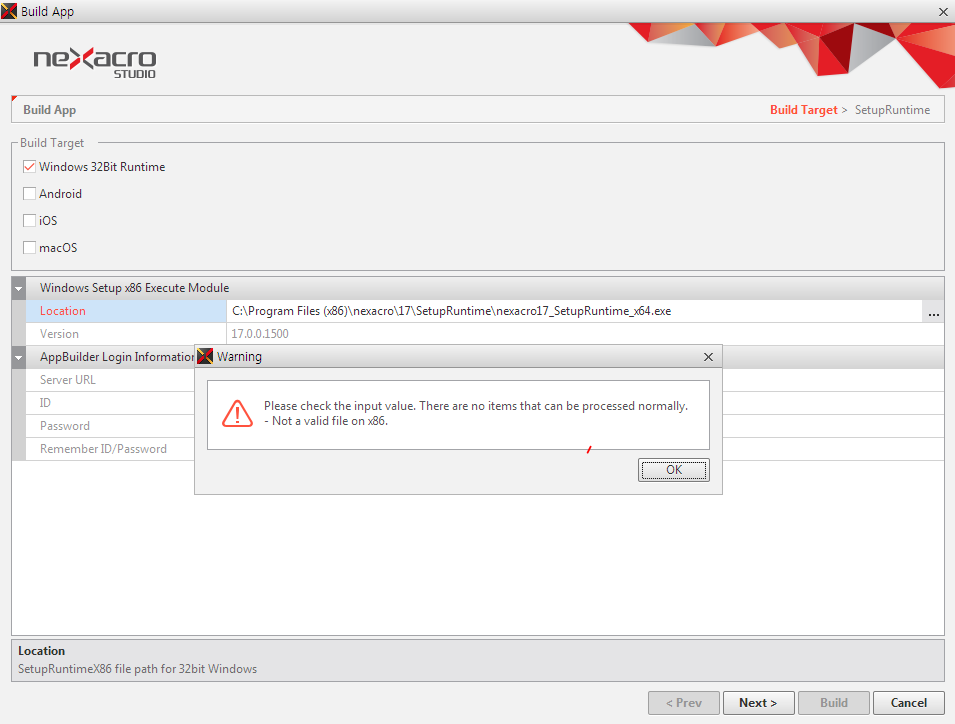 1. nexacrostudio에서 BuildApp시 Build Target과 일치하지 않는 모듈(x86/x64/XP)을 사용할 경우 에러메세지 창을 띄워주는 기능을 추가했습니다. (RP. 79284)