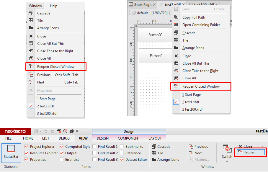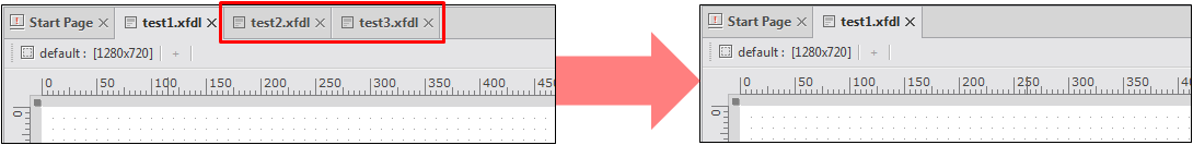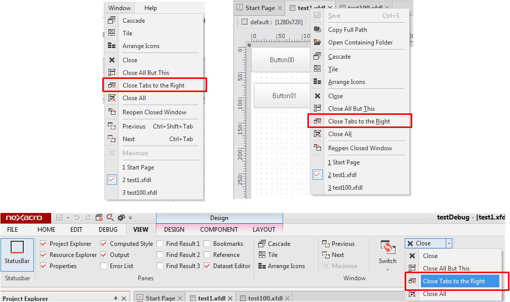 >> 해당 기능은 "nexacrostudio 메뉴의 [Windows] - [Close Tabs to the Right]", "nexacrostudio 리본 메뉴의 "[Close] > Close Tabs to the Right", "편집기 화면의 팝업 메뉴"에서 사용할 수 있습니다.