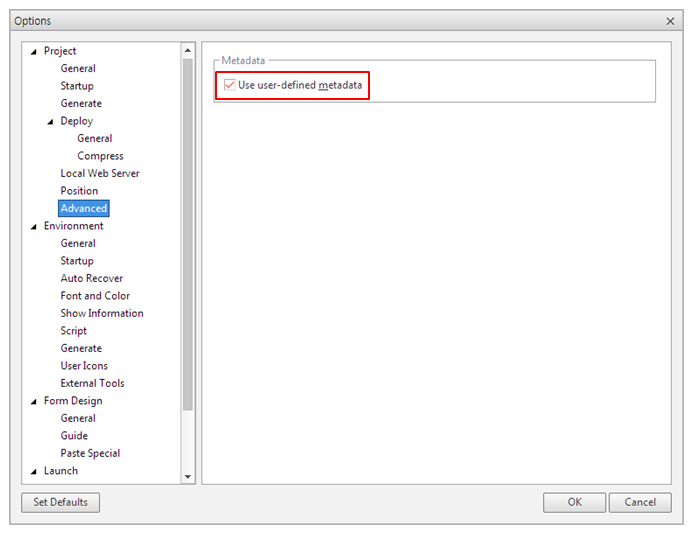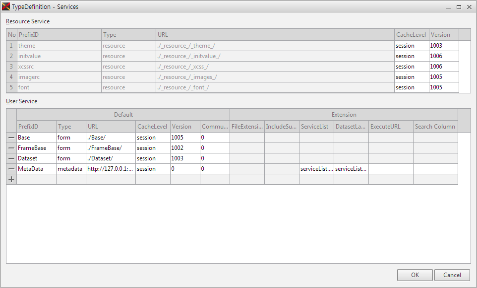 • MetaData 기능은 아래의 조건을 모두 충족하여야 활성화됩니다. >> "TypeDefinition - Services" 영역에 "metadata" type의 서비스가 정의되어야 합니다. >> "Project Explorer"에 MetaData 서비스의 ModelInfo가 로드되어야 합니다. >> "Tools - Options" 메뉴의 Option 창에서 "Project - advanced" 항목의 "Use user-defiend metadata" 옵션이 체크되어 있어야합니다. • 컴퍼넌트의 id와 text 속성에 MetaData Dialog를 open할 수 있는 버튼을 제공합니다. • MetaData Dialog에서 선택한 값이 id 또는 text 속성값으로 설정됩니다. |