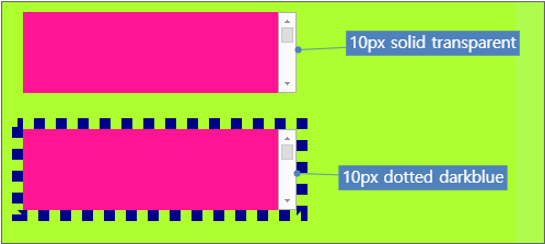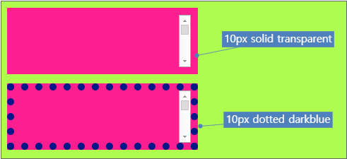 컴포넌트의 background 영역은 border 영역을 포함하고 있습니다. 예를 들어 border를 투명하게(transparent) 설정하면 컴포넌트의 background 영역이 표시됩니다. 아래 이미지의 경우 Div 컴포넌트의 background 색상을 지정하고 border 속성값을 10px로 지정했을 때 background 영역 위에 border가 표시되는 것을 확인할 수 있습니다.