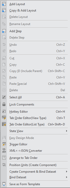 넥사크로 스튜디오 디자인 화면에서 Form 또는 컴포넌트 선택 시 지원하는 컨텍스트 메뉴 항목을 정리했습니다.(RP 92221)