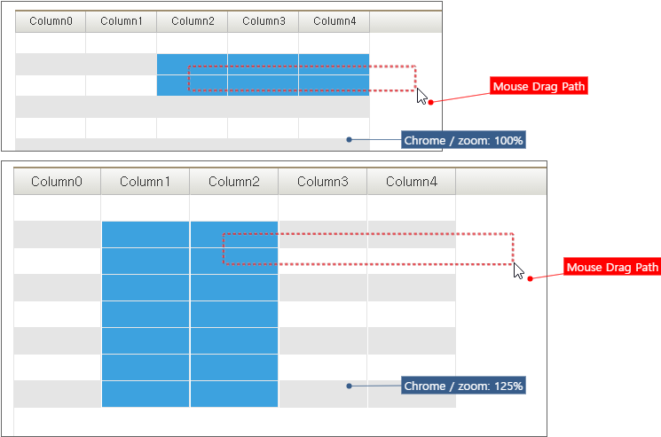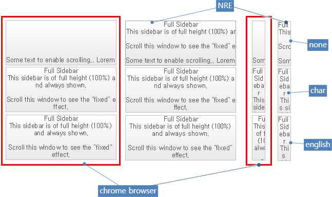 HTML 내 node 수가 많고 표 형식을 표현하기 위해 CSS 코드 내에서 테이블 모델을 사용하는 경우 화면 크기 변경 시 내부적으로 연산 처리가 발생합니다. 이 과정에서 하드웨어 성능에 따라 잔상이 발생할 수 있습니다.