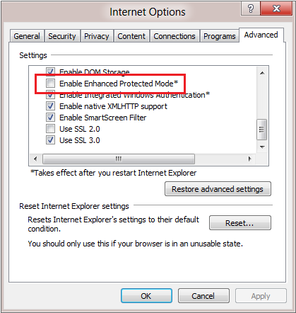 IE10 이상 브라우저에서 [향상된 보호 모드] 옵션을 활성화한 경우 윈도우 폴더를 보호하기 위해 특정 폴더만 접근할 수 있도록 경로가 가상화되어 처리됩니다. 사용자가 해당 옵션을 활성화한 경우에 파일 내려받기 경로를 지정하는 기능을 사용할 수 없습니다.