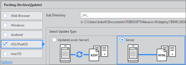 해당 기능을 사용하려면 Packing 단계에서 Update Type을 "Server"로 지정해서 서버에 있는 HTML 파일에 접근하는 형식을 선택해야 합니다. Update Type을 "Update" 또는 "Local"로 지정한 경우에는 WebBrowser 컴포넌트에서 callMethod 메소드를 사용해 HTML 파일에 접근하는 기능을 사용할 수 없습니다.