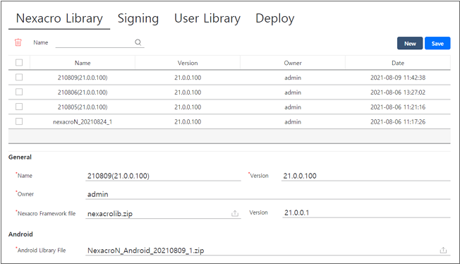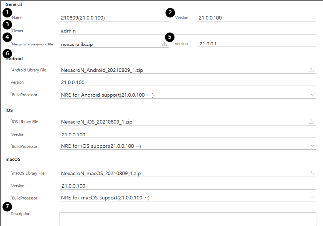 6 | Library File | Uploads the library file. ex) Android : nexacroN_Android_2021xxxx_1.zip iOS : nexacroN_iOS_2021xxxx_1.zip macOS : nexacroN_macOS_2021xxxx_1.zipThe uploaded item can be downloaded by clicking with the mouse.