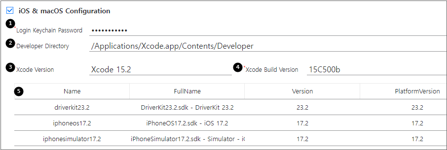 Xcode와 관련 SDK가 정상적으로 설치된 경우라면 관련 설정을 자동으로 확인하고 설정값을 표시합니다. 설정값이 표시되지 않는 경우에는 Xcode나 SDK가 정상적으로 설치되었는지 확인합니다.