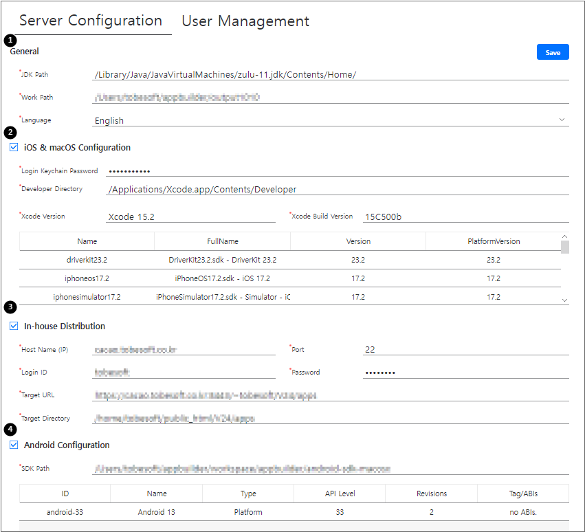 In-house Distribution 항목이 설정된 경우에는 앱 빌드 시 .ipa 파일과 .plist 파일을 설정된 서버로 전송합니다. 빌드된 앱을 내려받을 때 설정한 Host 정보를 적용합니다.