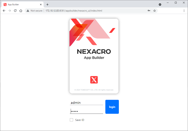 App Builder 설치 이후 관리 콘솔에 접속해 App Builder 사용을 위한 설정을 진행합니다. 관리 콘솔에 접속하면 로그인 창이 표시됩니다. 최초 로그인 시 ID는 "admin", Password는 "admin"입니다. Password는 로그인 후 메뉴[User]에서 변경할 수 있습니다.