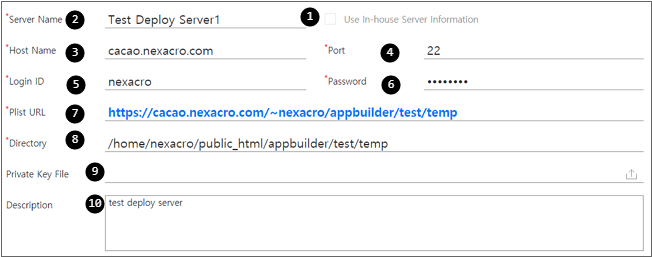 8 | Directory | Path information in the server where the resource file will be uploaded ex) /home/dummy/public_html/appbuilder/test/temp |