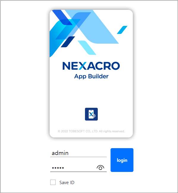 After installing the App Builder, access the management console and proceed with the settings for using the App Builder. When you access the management console, the login window is displayed. When logging in for the first time, the ID is "admin" and the Password is "admin". The password can be changed from the menu [User] after logging in.