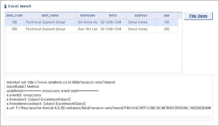 선택된 파일이 nexacro-xeni에 upload 되어 import된 결과가 grid에 표시 됩니다.